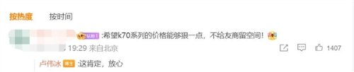 一位网友给小米集团卢伟冰留言:希望Redmi K70系列价格能够狠一点,不给友商留空间。对此,卢伟冰给出肯定回答:放心。