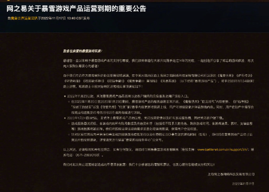 2022年11月23日起,暴雪游戏产品关闭了在战网以及客户端内的充值服务及用户注册入口。