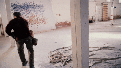 随着不断实验,他的绘画工具也在更新。例如画布根本没法承受他的抽打,需要更结实的材料,想要画出不一样的图案,画笔也要进行更换。