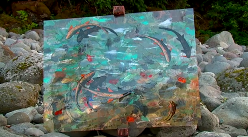 起初他也是老老实实地在画布上用写实手法描绘鱼儿在水中游动的情景,随着不断地投入,他也逐渐被阳光、岩石、河床、水流吸引得越来越深,也想要尝试更多的表现形式。