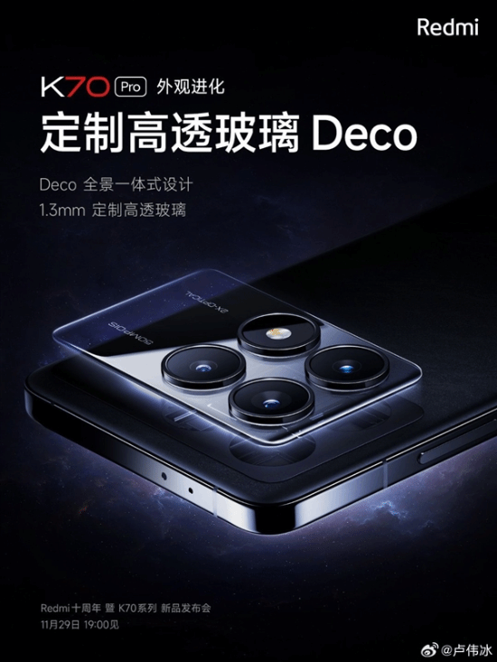 Redmi官方今早已经揭晓了K70 Pro的外观。新机后摄部分采用了与小米万元旗舰MIX Fold 3类似的模组设计,配备三颗摄像头。