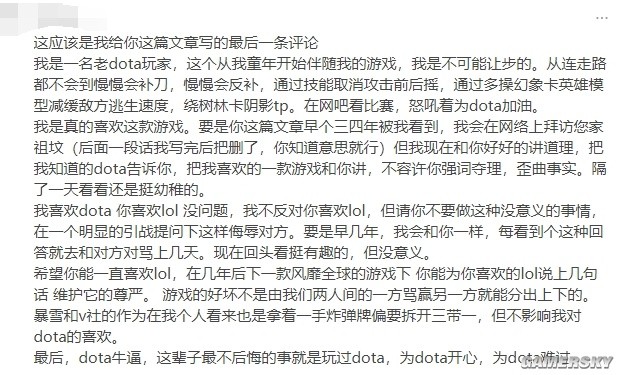 理性上来讲,骂战中的双方其实有很多都是并未接触了解过对方的玩家,就像一些声音总是片面的吐槽对方“一方团战就是不停地甩技能,另一方团战就是不断地AAA”一样,有不少人都是盲目地跟着自己方的人群,在那颗“祖传”的仇恨之种下,继续着无休止的骂战。