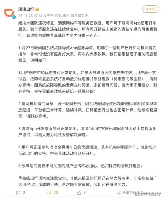 从用户反馈看,11月27日晚间10点多起,陆续有用户反馈无法使用滴滴旗下相关App,滴滴抢修超过了9小时。