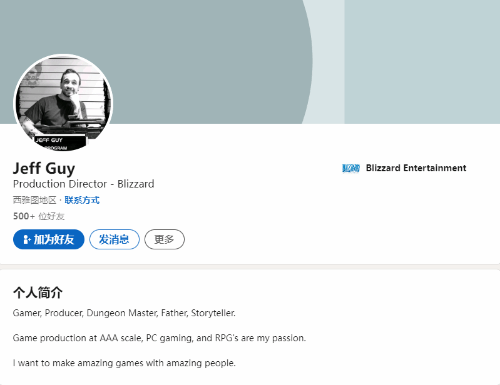 近日,根据领英信息,行业大佬Jeff Guy来到暴雪担任制作总监。