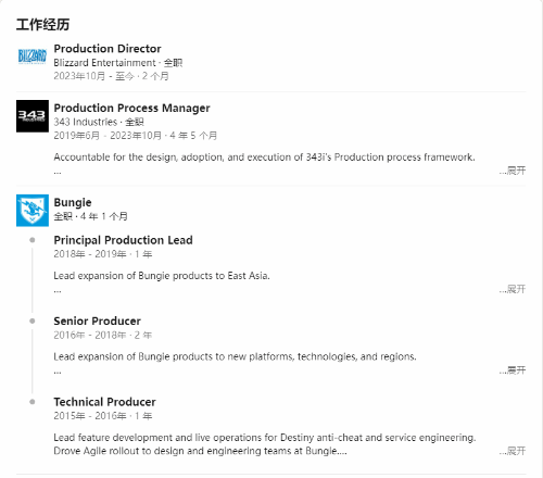 他履历十分豪华,包括在微软做Xbox360的开发QA工程师长达8年,Bungie做了4年的生产制作负责人,后来在343做了4年制作流程经理,现在来到暴雪,网友们纷纷猜测他或许是来为暴雪的新作《奥德赛》加速的。