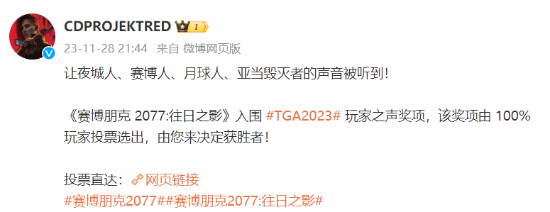 “让夜城人、赛博人、月球人、亚当毁灭者的声音被听到!《赛博朋克 2077:往日之影》入围TGA2023玩家之声奖项,该奖项由 100% 玩家投票选出,由您来决定获胜者!”