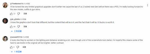 视频评论区有网友留言表示《最后生还者2复刻版》目前来看图像的改进并不明显,感觉只是视效细节和清晰度方面有所提升。也有网友认为即便如此,游戏带来了新增的删减关卡和新肉鸽生存模式等不少内容,10美元(90港币)升级还是很有性价比的。