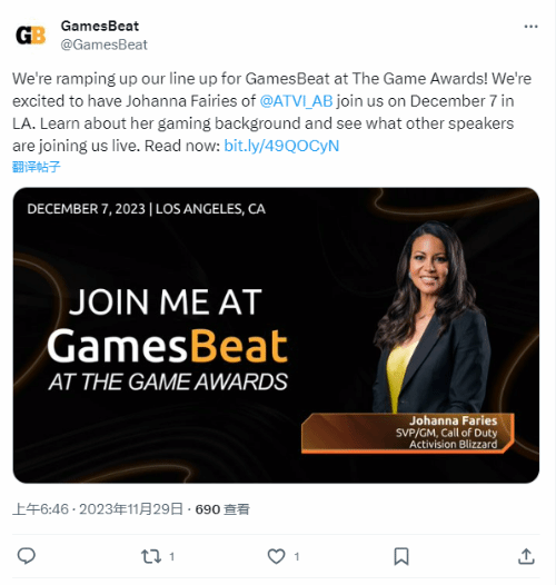 动视暴雪高级副总裁兼使命召唤IP总经理Johanna Faries受邀将在TGA发表演讲。
