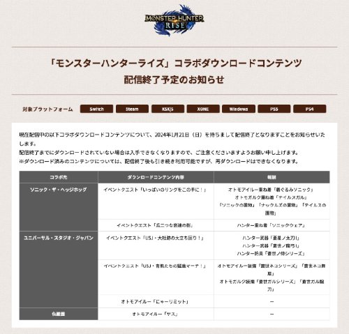 今日(11月29日),卡普空官方宣布:《怪物猎人 崛起》部分合作下载内容,将于2024年1月21日结束发布。如果在结束之前没有下载,之后将无法获得。已经下载的内容,在发布结束后依旧可以继续使用,但不能重新下载。