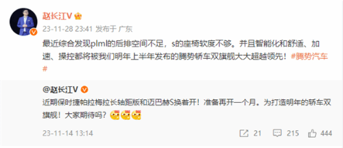 11月28日晚他分享了自己的感受:“最近综合发现plml的后排空间不足,s的座椅软度不够。并且智能化和舒适、加速、操控都将被我们明年上半年发布的腾势轿车双旗舰大大超越领先!”