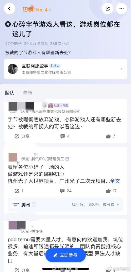 日前,有消息称,字节跳动将大规模收缩游戏业务朝夕光年。11月27日,此消息冲上热搜引发公众关注。甚至网传某游戏公司发布招聘海报,欢迎字节朝夕光年员工加入,各大厂HR也在朝夕光年深圳总部楼下开启“抢人大战”。