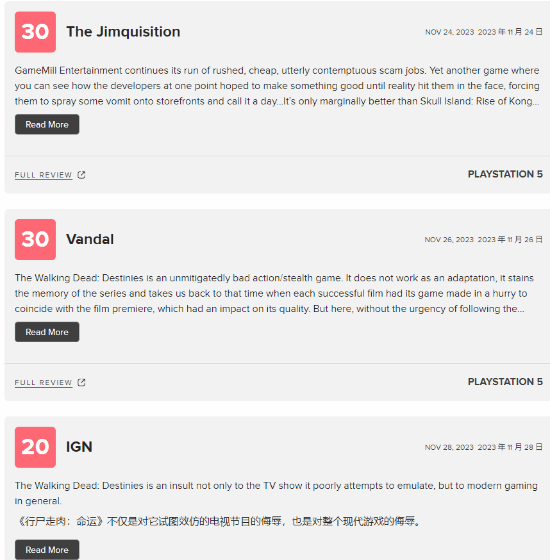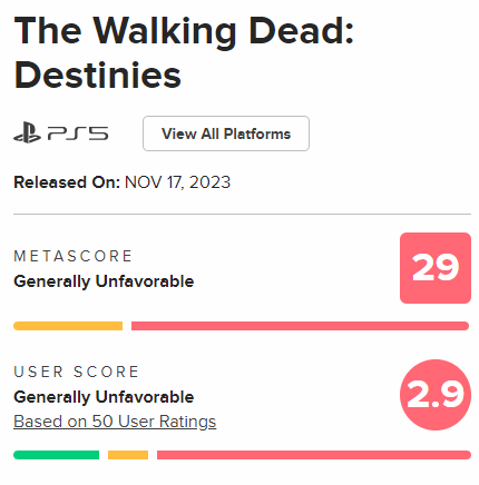 《行尸走肉:命运》媒体口碑已全面解禁,目前该作在M站的媒体均分仅为29分(百分制),玩家评分2.9分(十分制)。