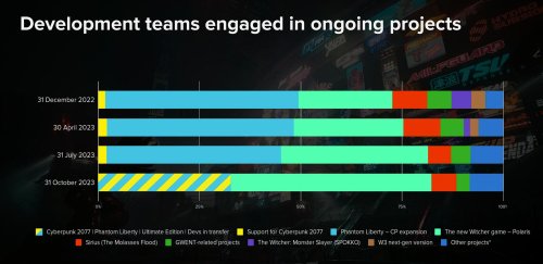 CDPR于报告内指出,由于2.0版本的发布,本作在Steam上的评价持续向好,据统计在过去30天内超过1万条的用户评论中有92%是正面评价。在10月底时仍有大约220名开发人员在负责《赛博朋克2077》项目,如今其终极版已经推出,CDPR将把精力转向全新作品。目前已有超半数员工在开发《巫师》系列全新作品。