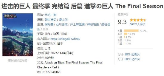 《进击的巨人》大结局目前豆瓣评分9.3分,有6万人打分。