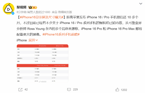 梨视频消息,距离苹果发布 iPhone 16 / Pro 手机预估还 10 多个月,不过目前已经有不少关于 iPhone 16 / Pro 系列手机的爆料和已知内容,从可靠业界分析师 Ross Young 在内的多个消息来源称,iPhone 16 Pro 和 iPhone 16 Pro Max 都将配备更大的屏幕。