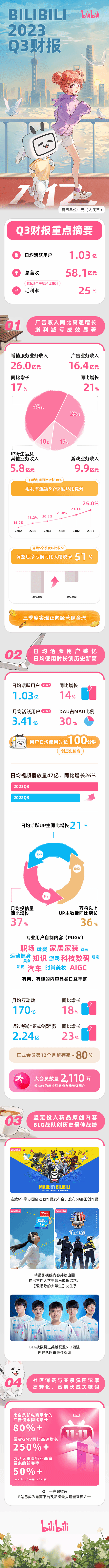 第三季度,B站用户与社区持续活跃增长,日活用户首次破亿,月活用户3.41亿,均创历史新高。季度总营收58.1亿,毛利润同比增长38%,毛利率连续五个季度环比提升至25%。本季度B站实现正向经营现金流,调整后净亏损大幅收窄51%,朝着盈利目标稳步迈进。