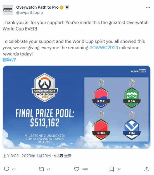 暴雪宣布“2023《守望先锋》世界杯”成为有史以来最伟大的守望先锋世界杯!奖金池最后达到513162美元(约合人民币365万元),并且为玩家们解锁了世界杯四强的武器吊坠。 ???