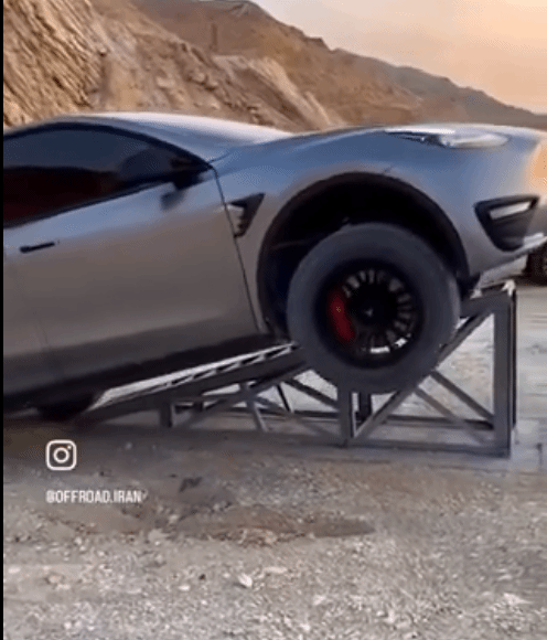 从图中可以看到,这辆Model Y为高性能版本,仅仅换装了大尺寸的越野轮胎,和行程更高的越野悬挂,就轻松的登上了坡顶。