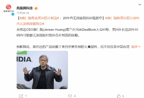 凤凰网科技消息,英伟达CEO黄仁勋(Jensen Huang)周三在出席DealBook大会时称,美国在长达20年时间内可能都无法摆脱对海外芯片制造的依赖。