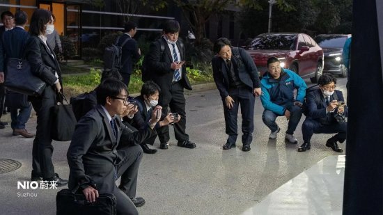 从现场拍摄的照片看,几名身着黑色西服西裤,背着双肩包的男女,大部分蹲坐在换电站门口,纷纷举着手机对着站内一台正在换电池的蔚来电车拍个不停,不远处则是蔚来的工作人员。