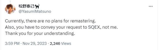11月29日,松野泰己在X/Twitter上发帖称:“目前没有复刻的计划。此外,你必须向Square Enix传达你的请求,而不是我。谢谢你的理解。”