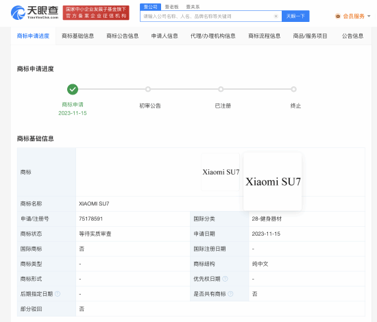 据天眼查显示,近日,小米科技有限责任公司申请注册“XIAOMI SU7”商标,当前商标状态为等待实质审查。