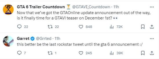 而R星官推那边则仍然看上去闲云野鹤,今日还在更新《GTA Online》的消息,玩家们在评论区里已经将此忽略,讨论的都是《GTA6》,激动地谈论着12月——《GTA6》月的到来。