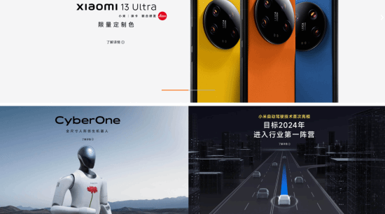 目前该官网主要由三个页面构成,一个是小米13 Ultra,一个是CyberOne全尺寸人形仿生机器人,另一个是小米自动驾驶技术首次亮相,目标2024年进入行业第一阵营,且三个页面均无法点击。