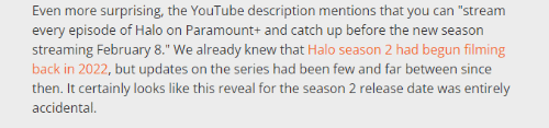 此外,官方频道的说明中还透露《光环》第二季将在2024年2月8日开播:“在Paramount 上观看全部剧集,并在2月8日推出新一季之前补全剧情。”