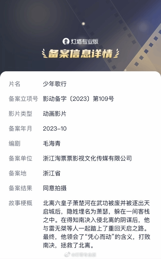 据灯塔专业版备案信息库,动画电影《少年歌行》电影版通过立项备案。