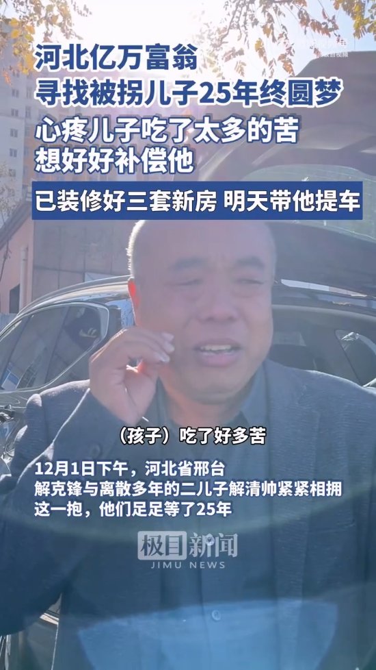 “他吃了不少苦,太心疼了。”解克锋哽咽道,他已经为儿子准备好了房子,都已经装修好了,明天他打算带儿子去提一辆车,“特别对不住孩子,我想把这25年缺失的,都补回来。”