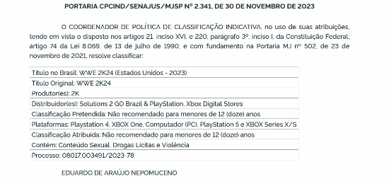 据VGC消息,暂未正式公开的《WWE 2K24》已在巴西获得分级。分级信息显示,新作将登陆PS4、PS5、Xbox One、XSX|S和PC平台。