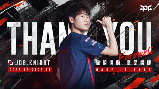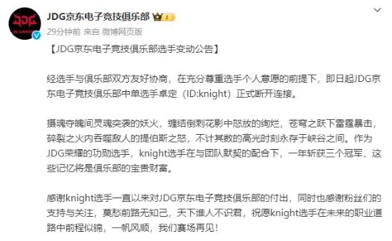 感谢knight选手一直以来对JDG京东电子竞技俱乐部的付出,同时也感谢粉丝们的支持与关注,莫愁前路无知己,天下谁人不识君,祝愿knight选手在未来的职业道路中前程似锦,一帆风顺,我们赛场再见!”