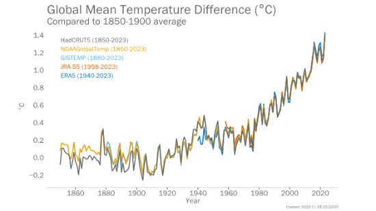 世界气象组织宣布2023年是有记录以来人类历史上最热的一年:“2023年的全球气候状况十分明确:事情发展如此快速,距离2023年结束还有整整一个月时间,我们已可以宣布,2023年是有记录以来人类历史上最热的一年。”