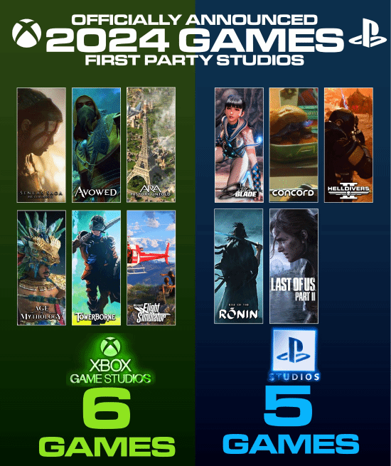 推主colteastwood总结了2024年Xbox和PlayStation确定推出的第一方游戏,Xbox有6款,PlayStation有5款。
