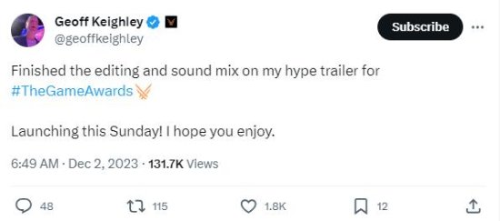 TGA创始人Geoff Keighley最新的一项简短声明似乎意味着今年的TGA离我们又更近了一些。他在今天发布的个人推文中表示:“TGA宣传预告片的剪辑和混音已经完成,将会于本周日正式发布,敬请期待”。