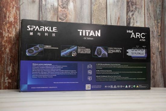 作为英特尔锐炫ARC A系列的显卡,Sparkle(撼与科技)Intel Arc A750 TITAN OC的包装是蓝色的设计风格,它上面有显卡的型号以及彩图,背景是宇宙以及星球,整体看起来科技感十足。