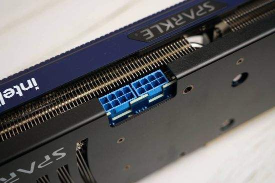 在显卡的供电接口部分,使用了两个蓝色的8pin输入接口,看起来十分的醒目,用来满足单卡225W的供电需求是完全没问题的。另外Sparkle(撼与科技)Intel Arc A750 TITAN OC的PCB也是蓝色的设计,配色方面可以说是高度统一。