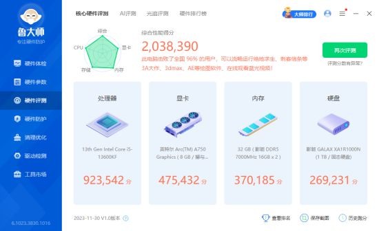 鲁大师综合性能跑分,得分为,其中显卡部分得分为。