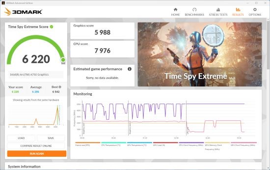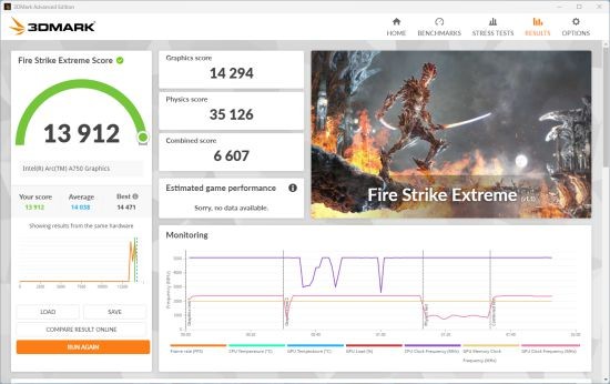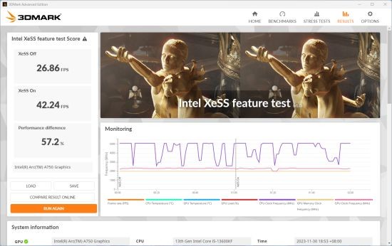 3DMark的XeSS跑分,开启前后帧率分别是26.86FPS与42.24FPS,支持该功能的游戏会有不错的性能提升。
