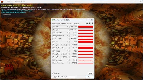 最后是Furmark拷机测试,在满载运行了13分钟以后,显卡的温度维持在了61℃,非常凉快,此时风扇转速为1541RPM,噪音很低,静音效果优秀。