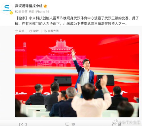 近日,小米创始人雷军现身武汉体育中心,观看了武汉三镇vs浦项铁人的亚冠比赛 。据武汉足球情报小组透露,在有关部门的大力协调下,小米成为下赛季武汉三镇潜在投资人之一。小米或考虑通过投资武汉三镇进行小米汽车华中地区市场渗透。 ?