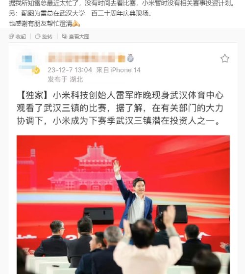 但随后小米集团公关部总经理王化在微博发文,澄清了雷军现场观战武汉三镇的谣言,并同时确认,小米集团暂时没有投资三镇的计划。