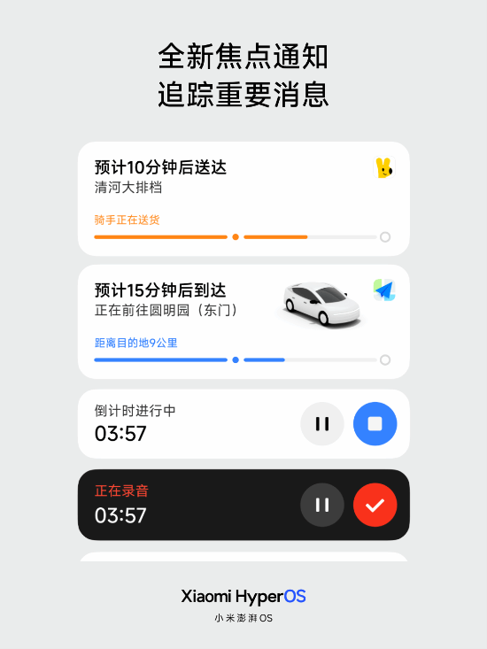 此外,澎湃OS还推出了全新的“焦点通知”,可以将打车、外卖、计时器、录音等状态实时显示,一眼就能看到终点信息,还能进行快捷操作。