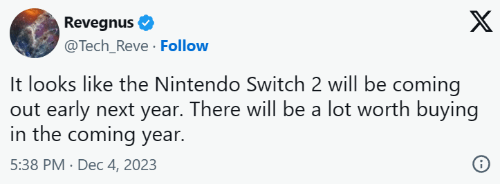 任天堂Switch 2尚未正式发布,很难说它将何时正式发布。虽然一切都似乎指向2024年底,但可预见的是,这款游戏机可能会比预期的时间提前发布。正如科技爆料人Ravengus今天所暗示:“看起来 Nintendo Switch 2 将于明年初推出。来年将会有很多值得购买的东西。”。