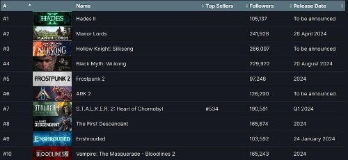 同样12月8日当天,《黑神话:悟空》凭借着TGA宣传片,随后在短短两天内实现了三连跨越,目前已经超过了《冰汽时代2》、《方舟2》、《潜行者2:切尔诺贝利之心》这三款游戏,现已来到第四名的位置。