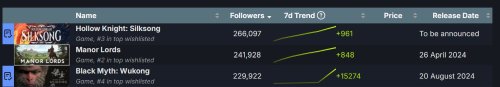 根据SteamDB数据显示,《黑神话:悟空》在Steam愿望单的排名目前已经升至第四名了!仅次于《哈迪斯2》、《庄园领主》、《空洞骑士:丝之歌》这三款老牌热门游戏。