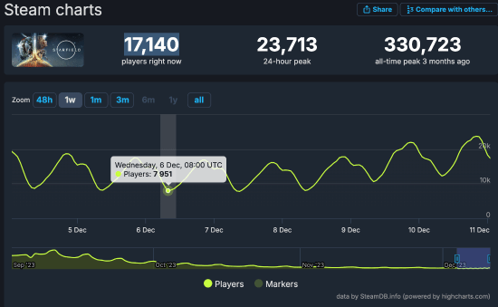 B社新作《星空》于今年9月份发售,目前已推出三个月。据SteamDB数据,其目前玩家在线数仅17140人,前几天的最低点更是来到了不到8000人。