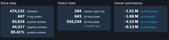 Twitch直播热度也非常惨淡,目前观众仅294人,24小时峰值观众643人。