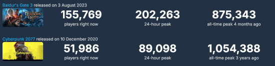 相比之下,八月份发售的《博德之门3》目前玩家数有155769人,近期迎来2.1更新和终极版的《2077》玩家数有51986人。
